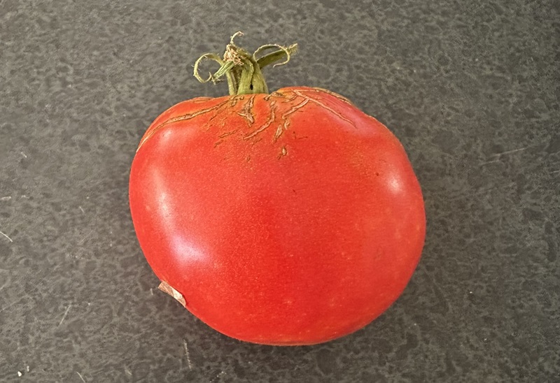 Red (Ripe) Stage: The tomato is fully colored, soft, and has reached its full flavor. However, it is also more susceptible to damage from pests. This tomato was picked at the breaker stage and ripened on the counter.